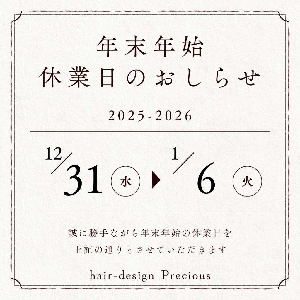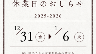 年末年始の休業日のお知らせです。2025年12月31日(水)から2026年1月6日(火)まで休業をいたします。1月7日(水)より通常営業いたしますのでよろしくお願いいたします。